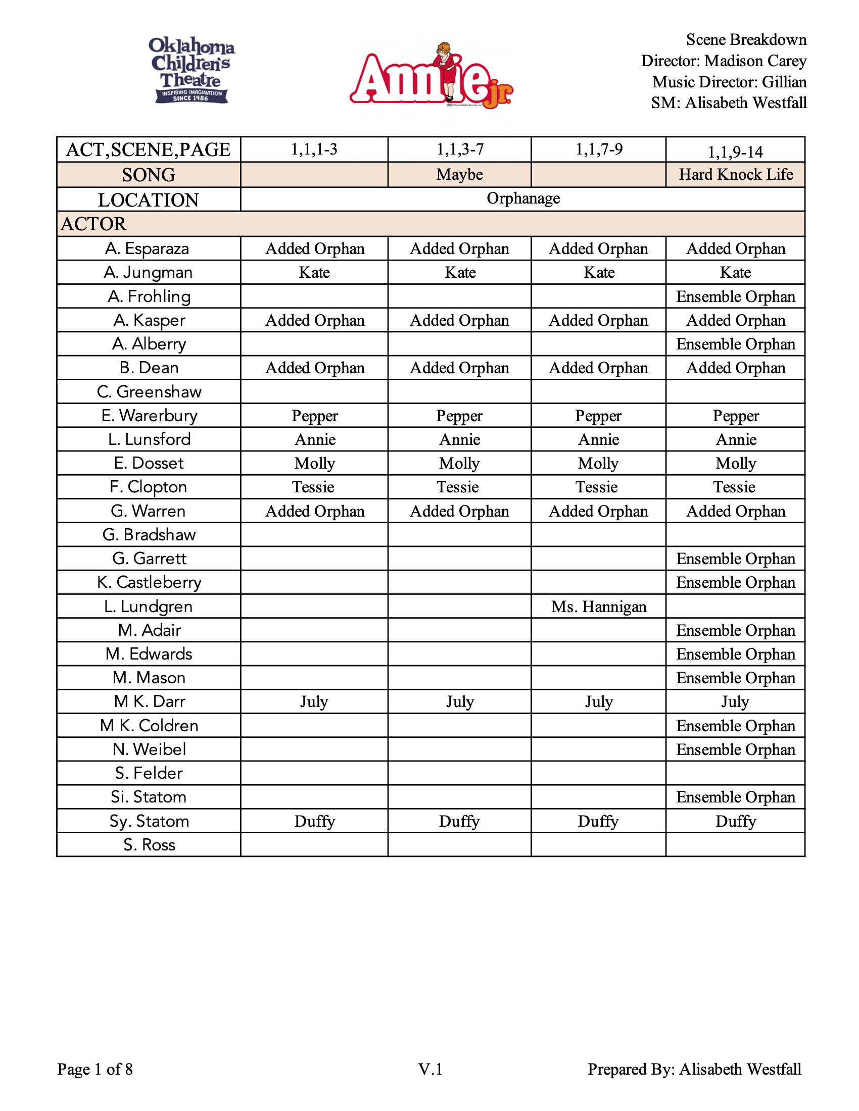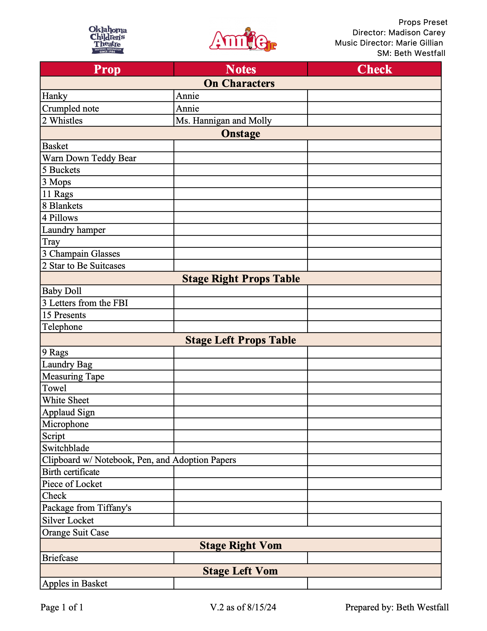 For Oklahoma Children’s Theatre Production of Annie Jr. I was the primary Stage Manager. My job included helping with fittings, making paperwork, running tech rehearsals, editing Qlab sound cues, taking blocking, and running the light and sound board during shows.