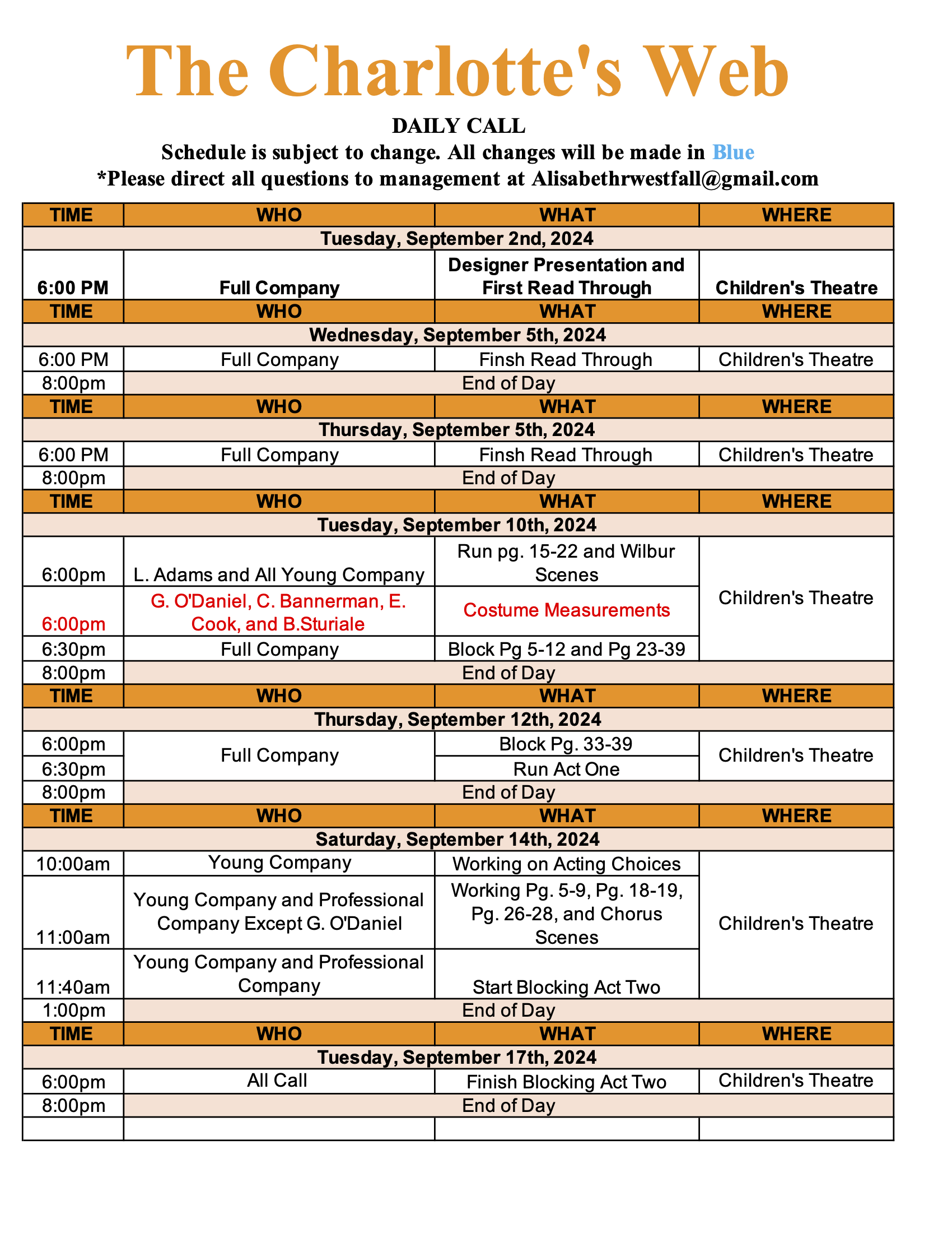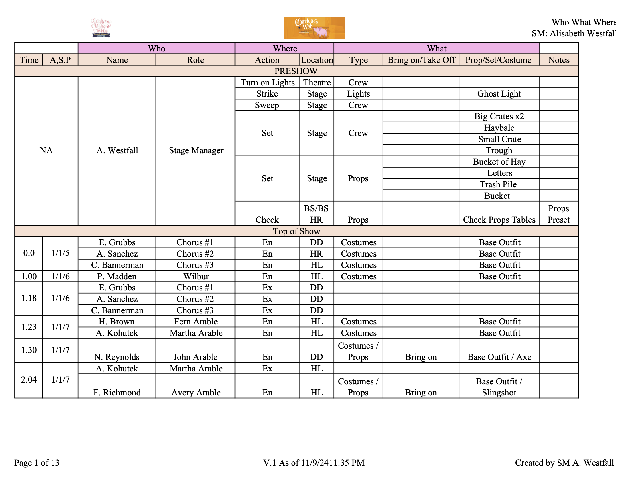 For Oklahoma Children’s Theatre Production of Charlotte’s Web I was the primary Stage Manager. My job included helping with fittings, making paperwork, running tech rehearsals, editing Qlab sound cues, taking blocking, and running the light and sound board during performances.