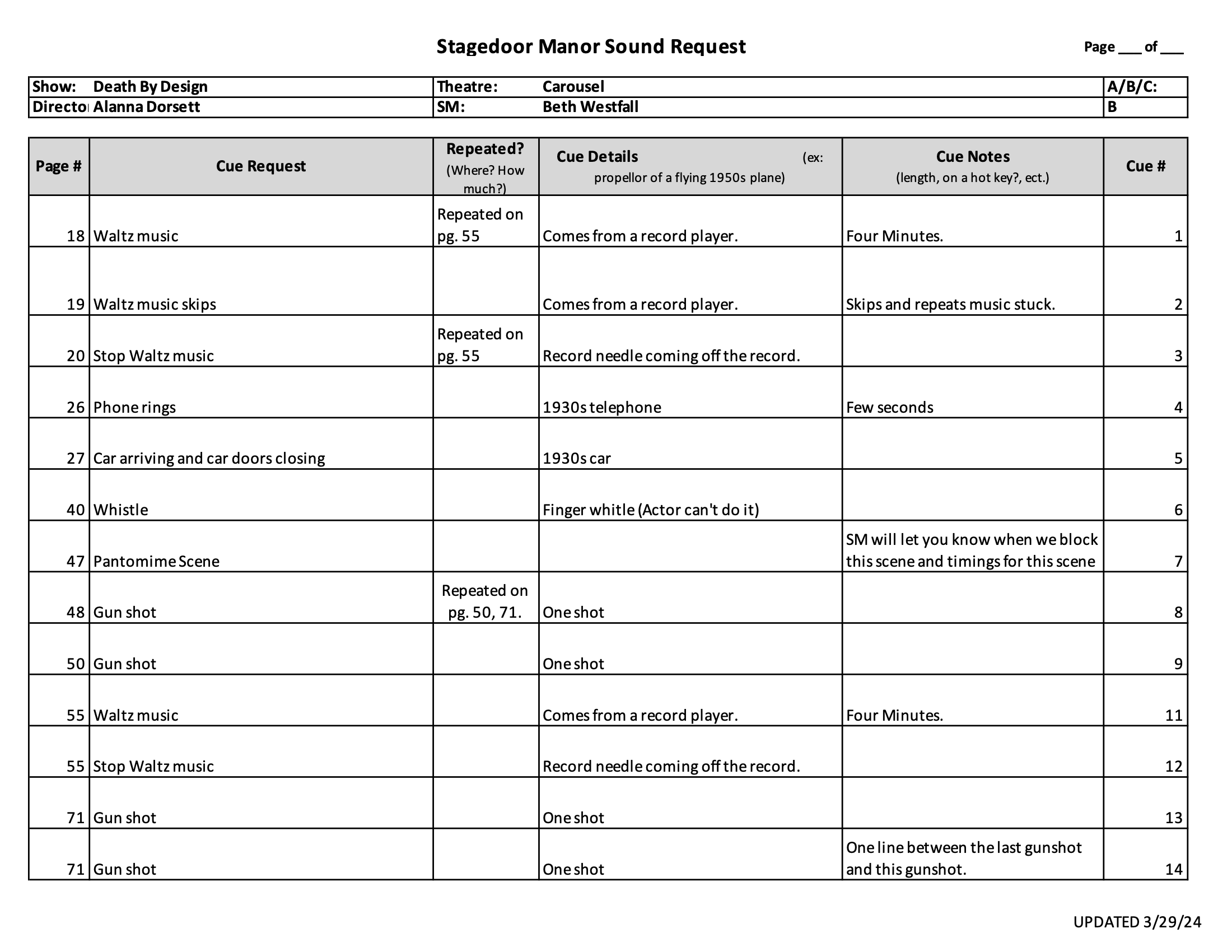 As the stage manager I was the responsible for using the provided templates for paperwork, write down all blocking, provide reports for rehearsals, shows, and production meetings. During shows I would make sure backstage was set up and called the show and ran the sound.