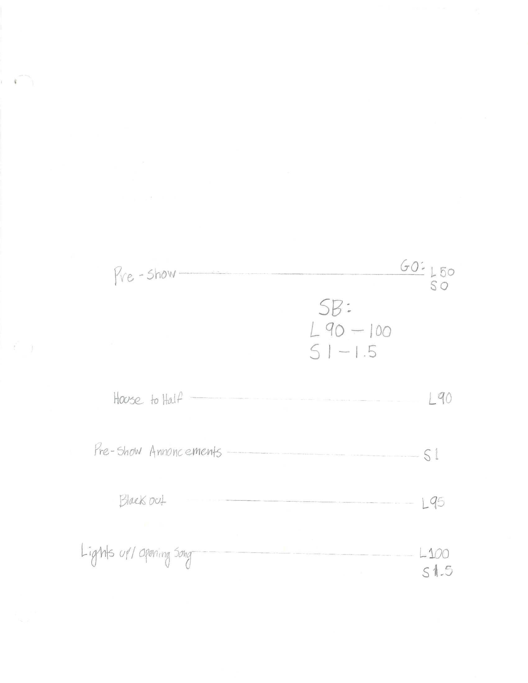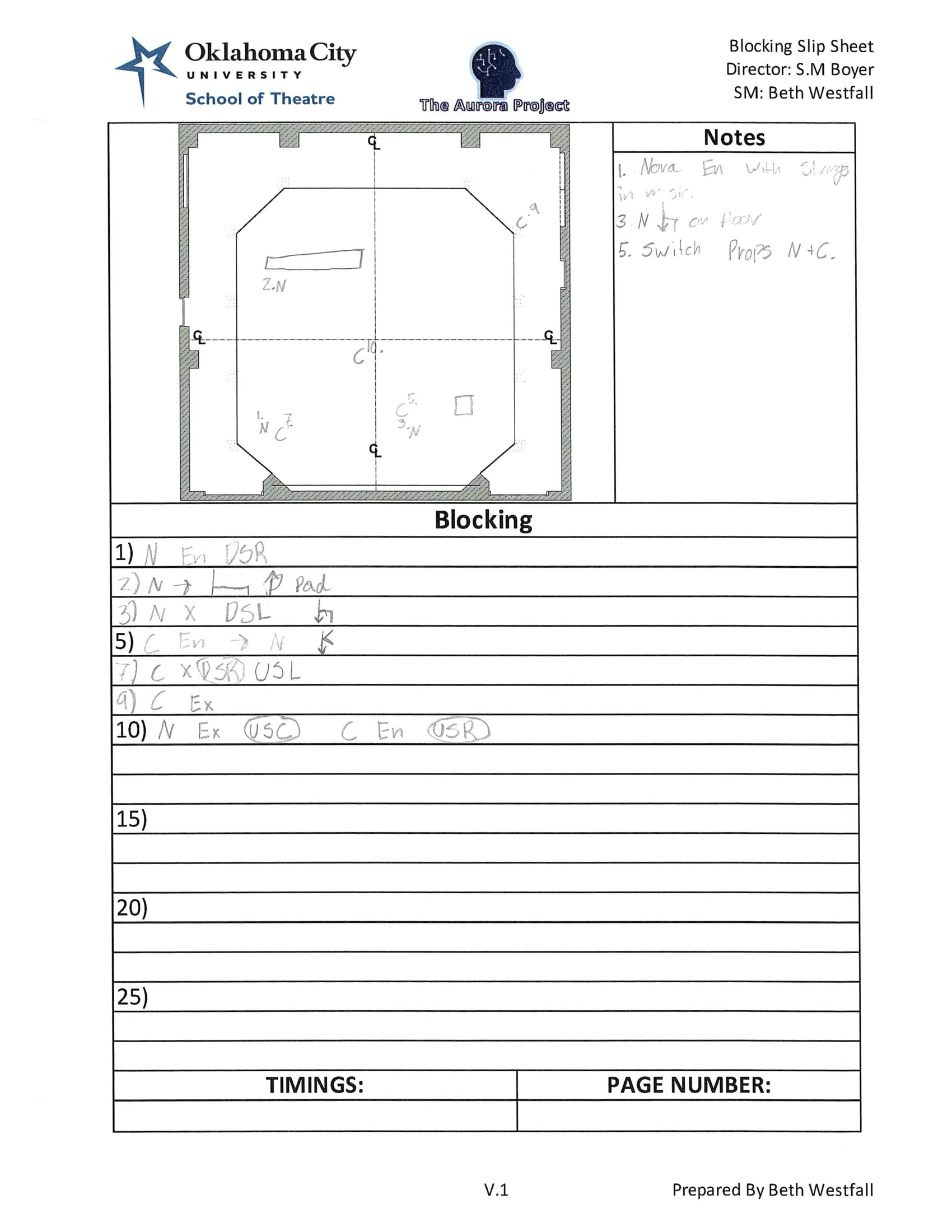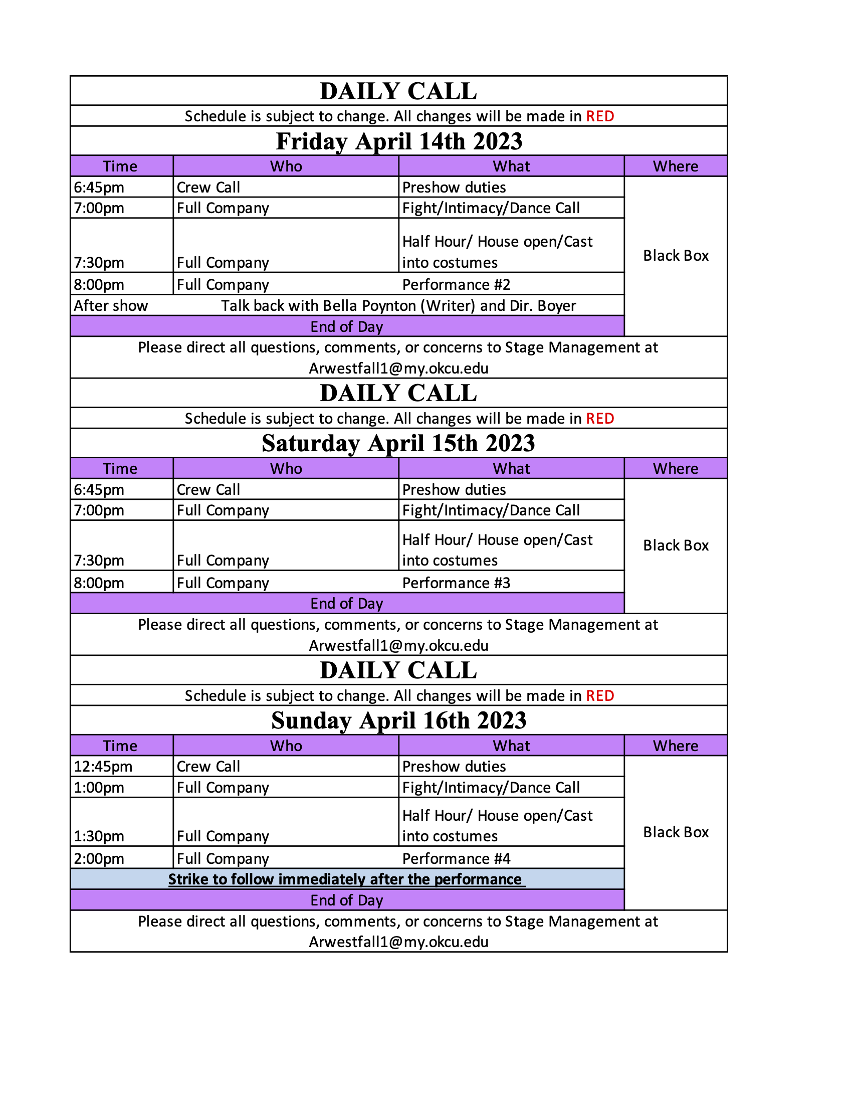 As the Stage Manager I was responsible for writing down all blocking, calling the show, making a block calendar, sending out the daily call and rehearsal/performance reports, and making all production paperwork.