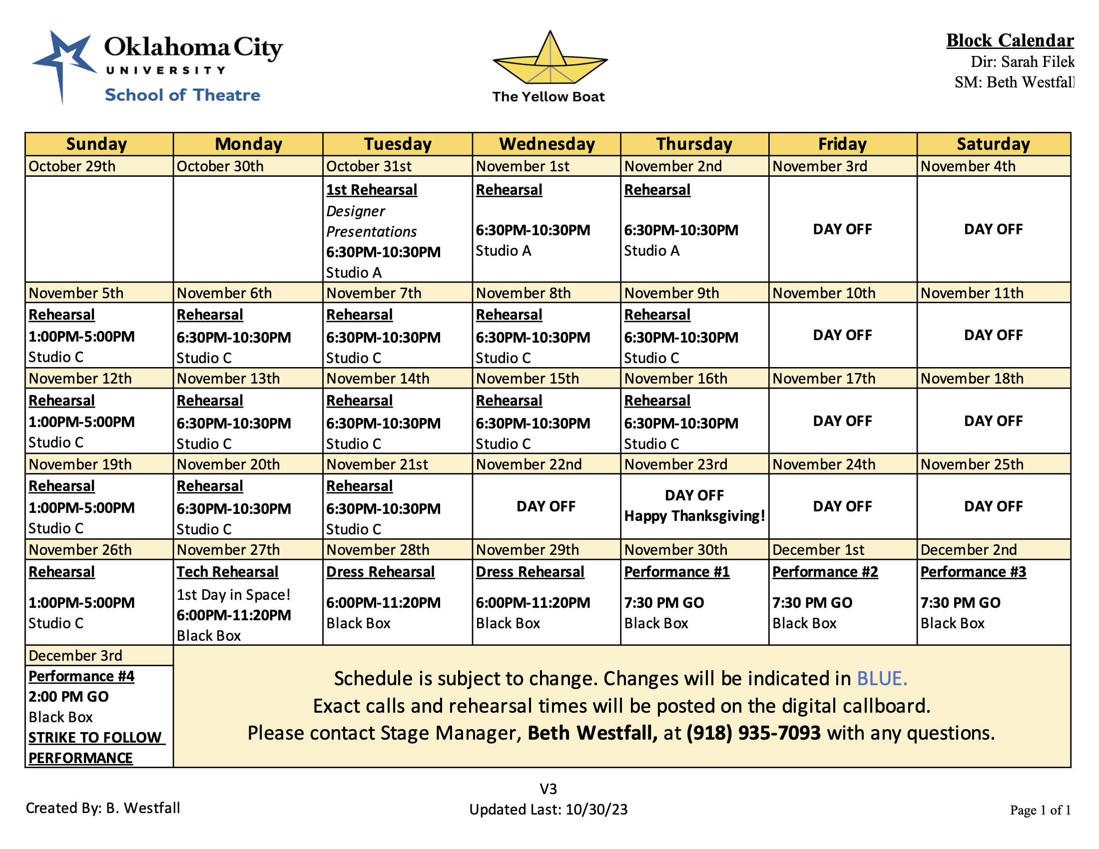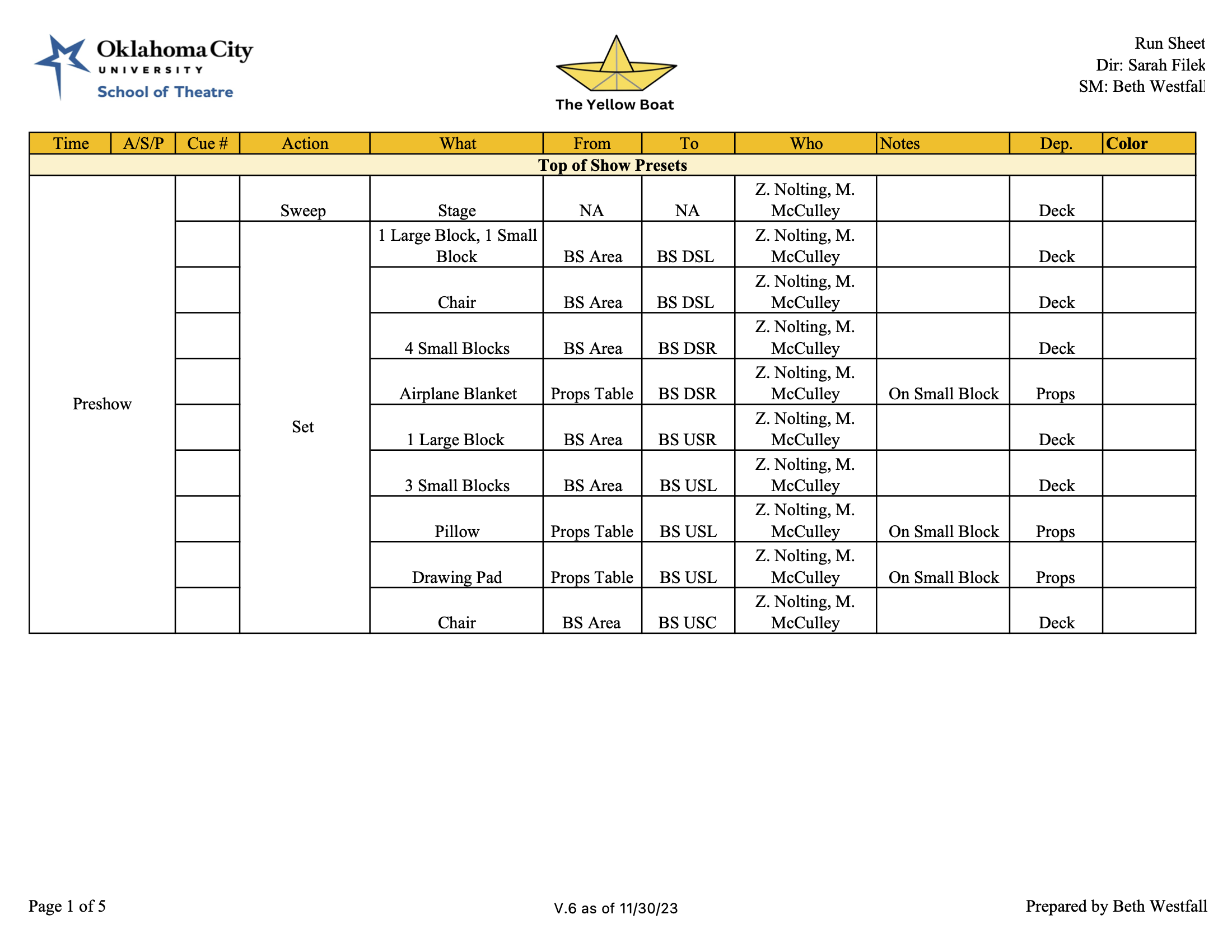 As the Stage Manager I was responsible for writing down all blocking, calling the show, making a block calendar, sending out the daily call and rehearsal/performance reports, and making all production paperwork.